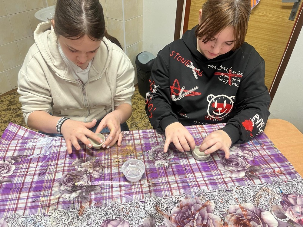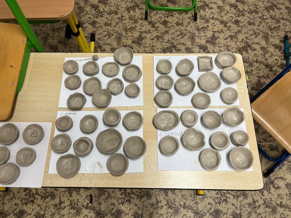 1. Stanoviště “PRAVĚKÁ TVORBA” – Velký úspěch mělo stanoviště s výrobou hliněných misek. Děti si vyzkoušely práci s hlínou a zjistily, jak náročné bylo vyrábět nádoby bez moderních nástrojů. Každý si odnesl svůj vlastnoručně vytvořený výrobek.