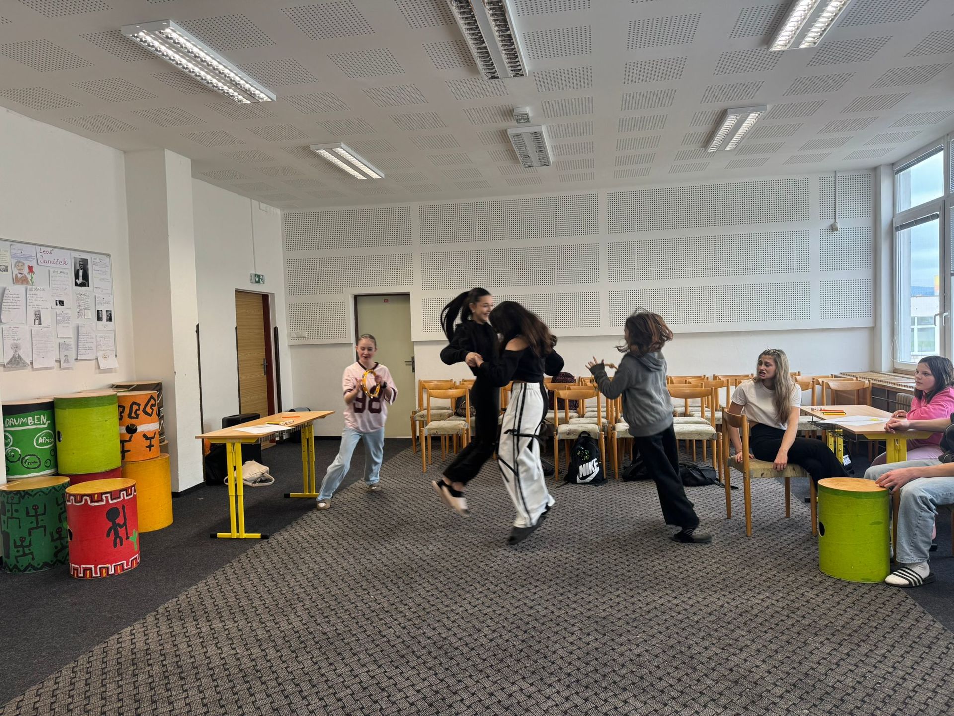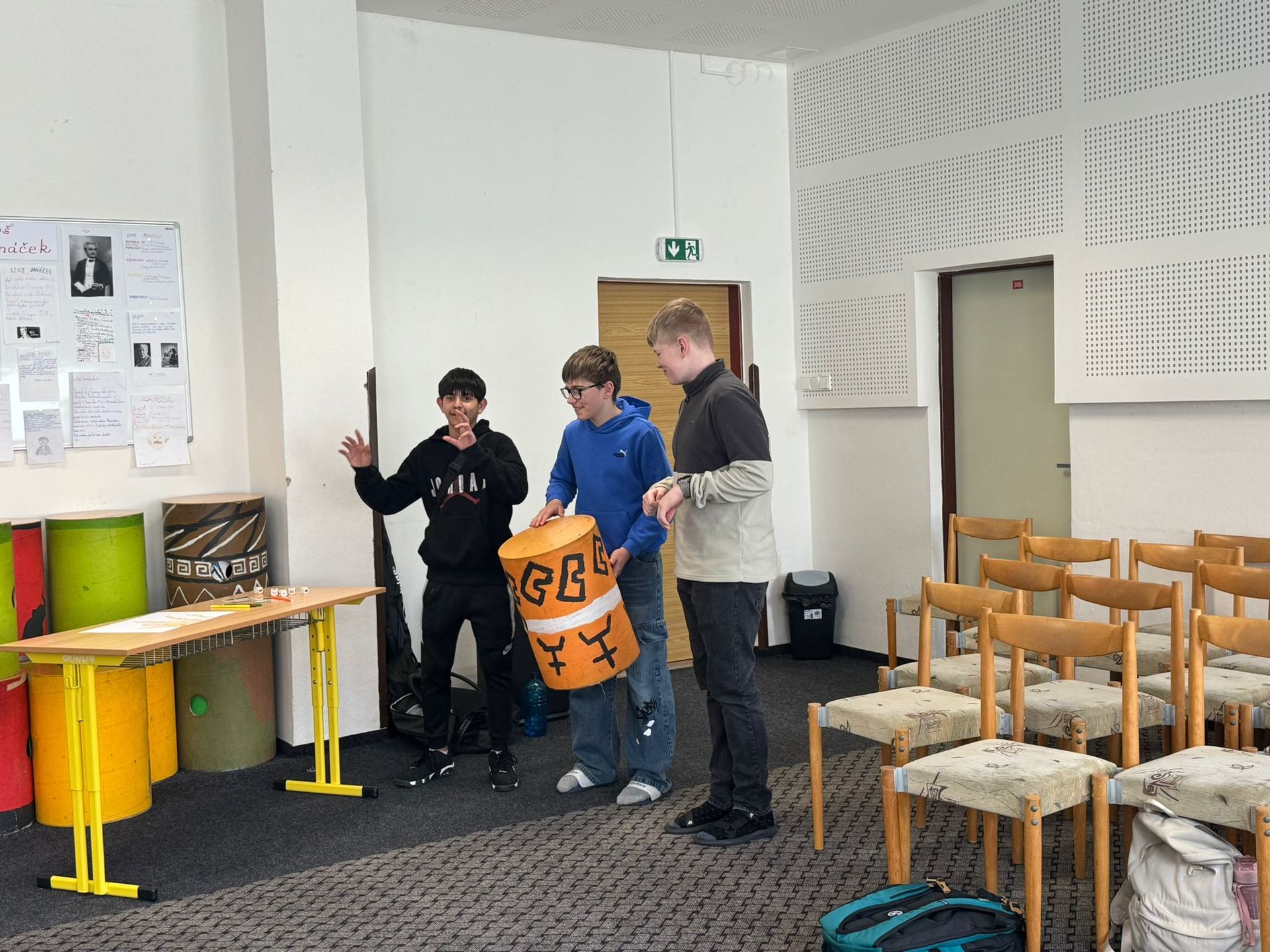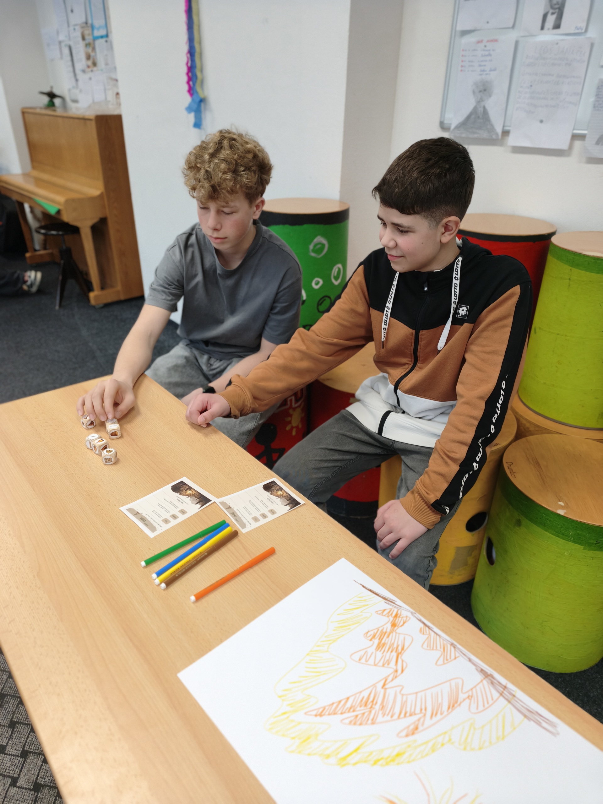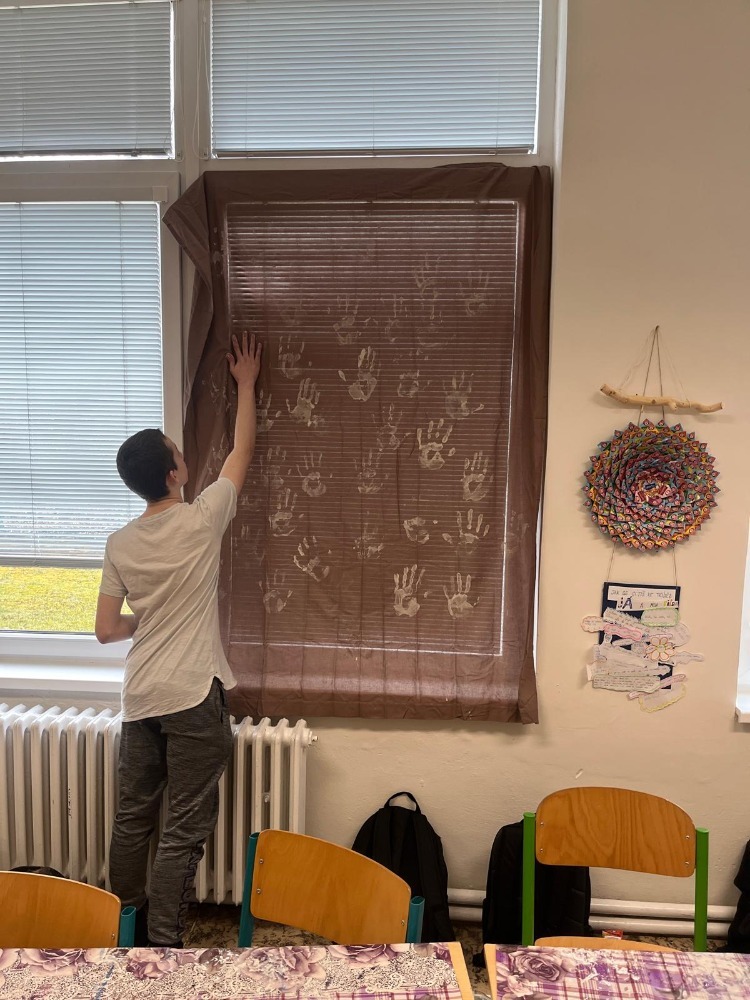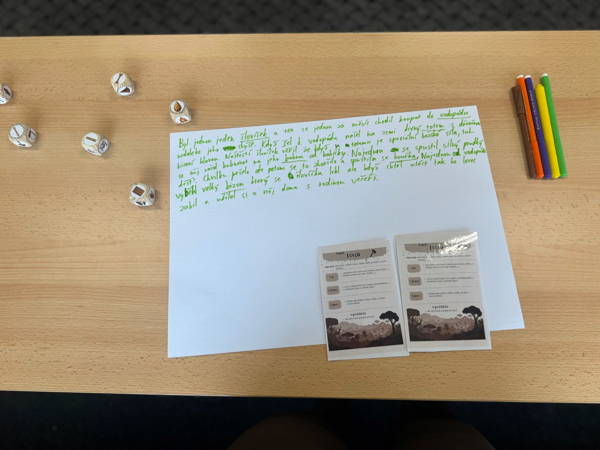 1. Stanoviště “PRAVĚKÉ UMĚNÍ – Na jednom ze stanovišť se žáci ponořili do světa pravěkých kmenů, vytvořili vlajku, nacvičili krátký rituální tanec a pomocí příběhových kostek vymysleli pravěké vypravování.